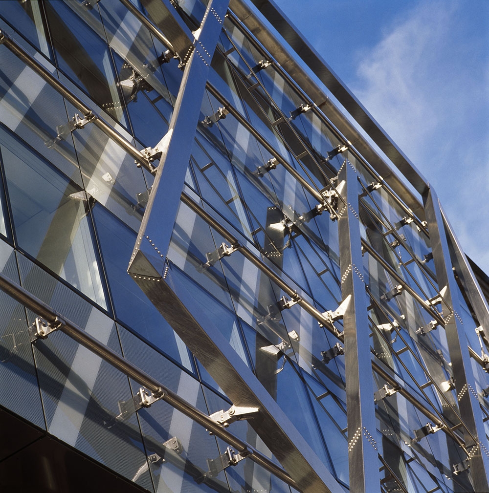 Konečné je tu nejnápadnější jev, z něhož se stal přímo znak: veliká posuvná mříž z nerezové oceli, tvořená rámem se šikmými stojkami mírně přesahující do sloupové podnože. Šikmým stojkám odpovídá i dekorativní pojednání skleněných parapetů se šikmými světlými pruhy (sériegrafie) vedenými ve stejném šikmém směru, které tvoři optické pozadí mříži.