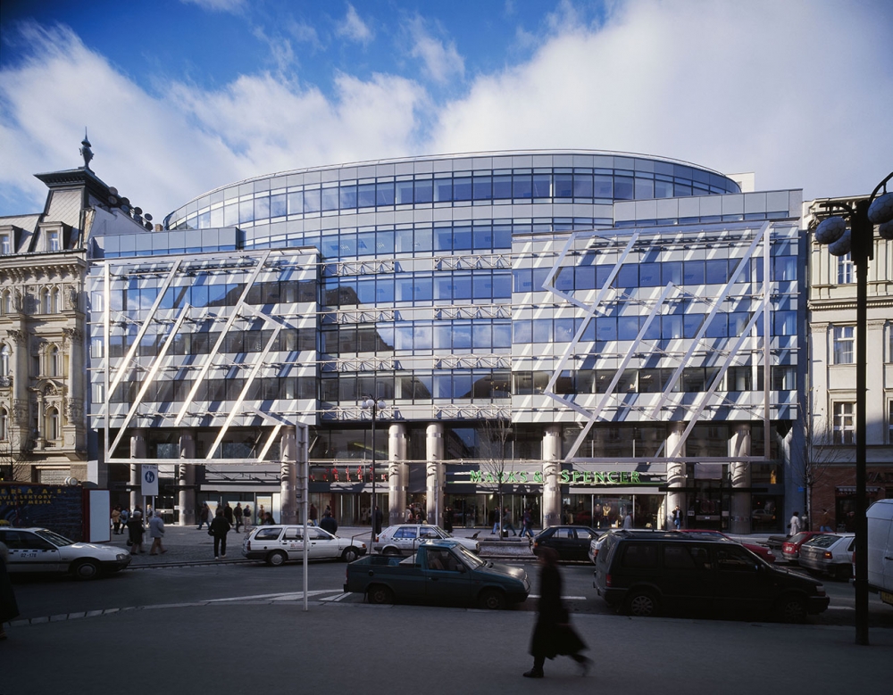 Nových je zde několik elementů: jednak výrazně řešená dolní, ustoupená "sloupová" podnož, nesoucí "skleněné", reflexní tělo stavby, a výrazné ohraničení průčelí vertikálními pásy s žulovým obkladem po stranách. Dále je to zaoblený segment středního pole průčelí, který prostupuje třemi patry nahoru (horizontální průběžný pás zmizel), ve čtvrtém se rozšiřuje pomocí kratších atikových úseků, ustoupených do stran nad hlavními bočními rizality a rozevírá tak stupňovitě pohled směrem vzhůru k širokému oválnému střešnímu pavilónu, dominantnímu elementu celé budovy.